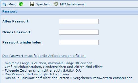 Das Passwort muss regelmäßig, alle 60 Tage, geändert werden. Mit einem Hinweis, der ab 10 Tagen vor Ablauf des Passworts angezeigt wird, werden Sie auf die erforderliche Änderung des Passworts aufmerksam gemacht.
