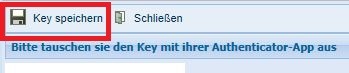 Auf der nächsten Seite wird ein individuell für den jeweiligen Anmeldenamen erstellter QR-Code angezeigt, der mit der Smartphone-App gescannt werden muss. Sollte das Scannen des QR-Codes nicht möglich sein, wird unterhalb des angezeigten QR-Codes zusätzlich auch ein "Key" als Zeichenfolge aus Buchstaben und Ziffern angezeigt, der manuell in der App eingetragen werden kann. Nach Scannen des QR-Codes bzw. Eintragen des "Keys" muss im folgenden Dialog auf der eBIS-Webseite auf [Key speichern] geklickt werden: