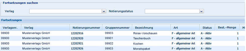 Hier werden Ihnen alle Fortsetzungsnotierungen des gewählten Kunden angezeigt. Die Suche kann nach Verlag und / oder dem Notierungsstatus erfolgen.