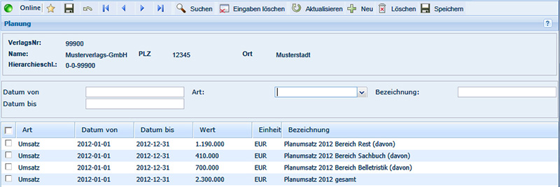 In diesem Dialog haben Sie die Möglichkeit Planwerte für den Umsatz, Absatz oder die Remissionsquote für den Verlag zu hinterlegen. Die hier eingegebenen Daten können Sie dann z. B. in Reports abfragen und so mit den IST-Werten vergleichen. Alle Benutzer, die Zugriff auf diese Planungsseite haben, sehen die eingestellten Werte.