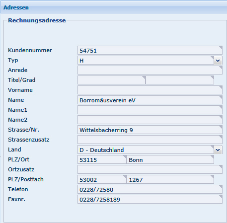 Im Bereich Rechnungsadresse wird die in den Stammdaten des Kunden gespeicherte Rechnungsadresse vorgeblendet. Hier können Sie keine Änderungen vornehmen. |