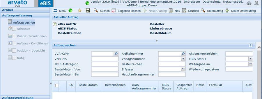 werden angezeigt. Die weiteren Menüs innerhalb der Auftragserfassung sind